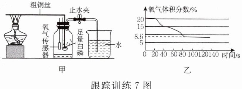 [2023·杭州]小金利用图甲所示装置(气密性良好)和试剂测定空气中氧气含量,集气瓶中空气的体积为 200mL,氧气传感器测得集气瓶内氧气的体积分数变化曲线如图乙所示。