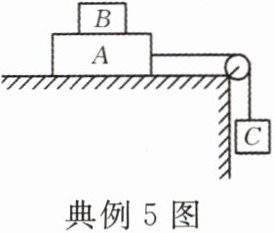 典例 5 $ A $、$ B $、$ C $ 三物块质量分别为 $ M $、$ m $、$ m_0 $,作如图所示的连接,绳子不可伸长,且绳子和滑轮的质量、滑轮的摩擦均可不计。若 $ B $ 随 $ A $ 一起沿桌面水平匀速运动,则可以断定( )