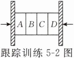 跟踪训练 5 - 2 如图所示,$ A $、$ B $、$ C $、$ D $ 是 4 块完全相同的砖,每块重 $ 50N $,$ A $、$ D $ 两侧是两块竖直且相同的木板,木板外侧分别用 $ 1000N $ 的力压紧,使砖处于静止状态。$ A $ 砖与木板内侧之间的摩擦力为 ______ $ N $;$ A $ 砖与 $ B $ 砖之间的摩擦力为 ______ $ N $;$ B $ 砖与 $ C $ 砖之间的摩擦力为 ______ $ N $。