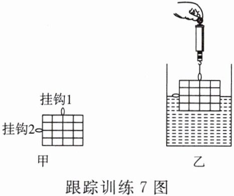 (2)如图乙所示,小科第一次用弹簧测力计挂住挂钩1,分别浸入水中4格、8格、12格,记下三次测力计的示数为$F_{1}$、$F_{2}$、$F_{3}$,发现$F_{1}>F_{2}>F_{3}$,得出“浸入深度越深,所受浮力越大”的结论。小松认为推理有缺陷,理由是______________________________。