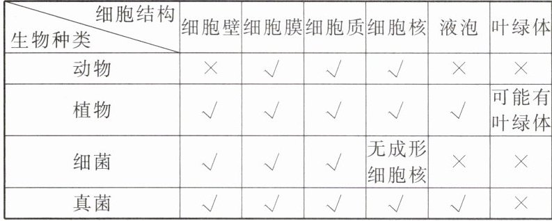 不同生物的细胞结构异同可用表格反映(“√”表示有相应结构,“×”表示无相应结构)。