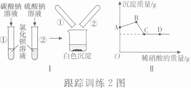 跟踪训练2 [2024·绍兴一模]如图Ⅰ所示,小科将反应后试管中的物质全部倒入烧杯时,发现烧杯内白色沉淀明显增多。为了探究烧杯内物质的成分,她立即向其中逐滴加入稀硝酸,并不断搅拌,烧杯内沉淀的质量随加入稀硝酸的质量变化如图Ⅱ所示。