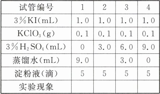 (2)为了保证各试管中氯酸钾和碘化钾浓度相同,第2只试管中应加蒸馏水mL。