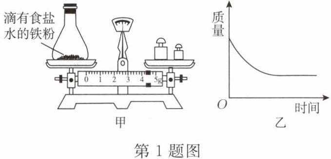 1. [2024·安徽]某实验小组按图甲装置验证质量守恒定律,一段时间后,发现锥形瓶内部分固体变为红棕色。实验过程中瓶内物质或元素质量变化与图乙相符的是(