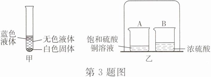 3. [2024·浙江]浓硫酸具有吸水性和脱水性。老师演示了如下实验:在一定量的饱和硫酸铜溶液中加入浓硫酸,可以观察到液体上部呈蓝色、下部为无色,出现白色固体沉积(如图甲所示),试管壁发烫。经检测白色固体是无水硫酸铜。