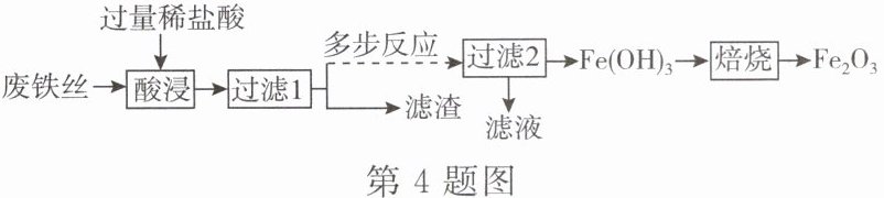 4. [2025·云南]现代绘画的红色颜料已很少使用赭石,而是通过化学方法制备Fe₂O₃。例如可用废铁丝(主要含铁和少量氧化铁,其余杂质不参与反应)制得,其工艺流程如图所示。