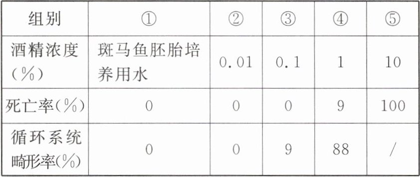 步骤3:将斑马鱼胚胎各10枚,分别置入等量不同浓度的酒精溶液和斑马鱼胚胎培养用水中。在受精卵发育72h时,观察胚胎存活和循环系统发育情况,记录如表所示: