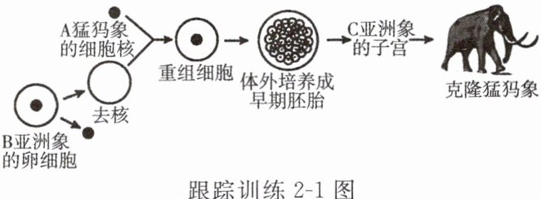【跟踪训练2-1】[2024·杭州上城区二模]猛犸象是生活在距今480万~1万年时期的一种哺乳动物,因气候变暖、食物短缺及人类捕杀等原因导致灭绝。近年科学家发现猛犸象的细胞核并提出采用克隆技术复活猛犸象,大致技术流程如图所示。下列说法正确的是