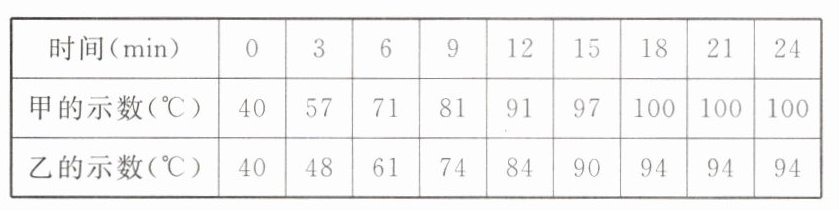 通过实验观察到小烧杯内的水没有沸腾,所以小明的观点是错误的。为了验证小李和小红的观点,观察并记录温度计甲和乙的示数变化,如表所示。