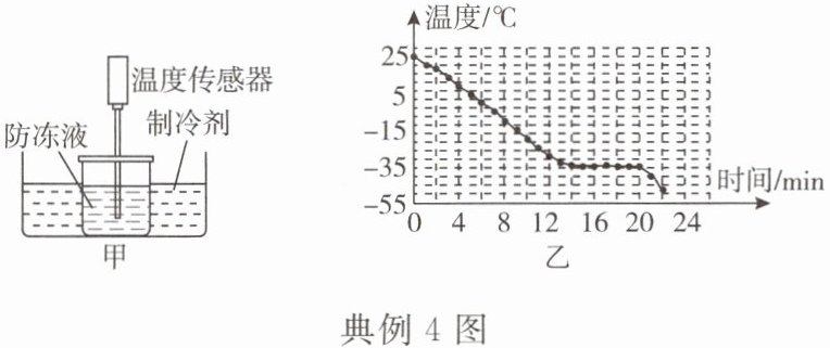 (1)烧杯中装有适量防冻液,置于制冷剂中,用温度传感器每隔1min记录防冻液的温度,绘制温度随时间变化的图像,如图乙。观察到14~20min防冻液处于固液共存状态,分析图像可知:防冻液在凝固过程中温度