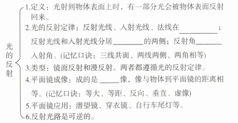 2. 光的色散现象:光通过三棱柱后发生色散现象,依次是红、橙、黄、绿、蓝、靛、紫。红色物体只反射红光,红色透明物体只透过红光,其他色光均被吸收。白色物体反射所有色光,黑色物体吸收所有色光。