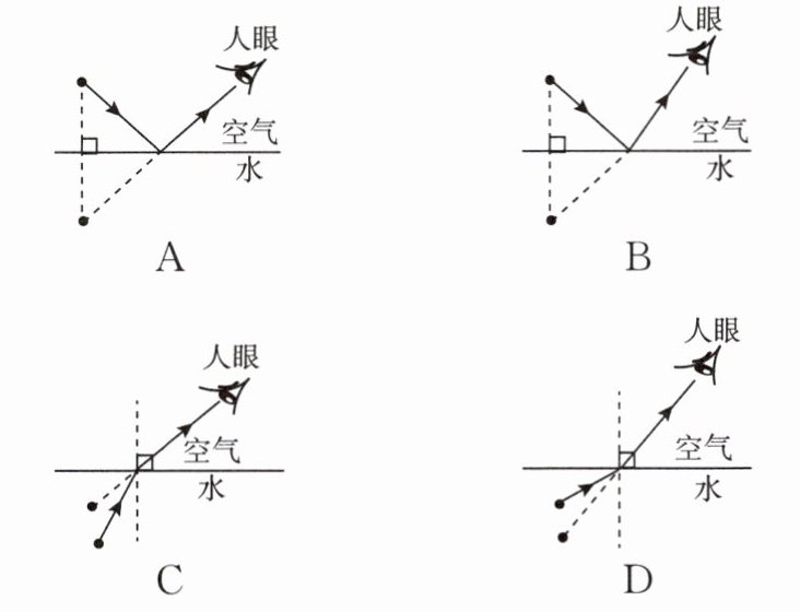 [2025·天津]如图所示,一只白鹭正在七里海湿地觅食,平静的水面映出它的身姿。图中能正确表示人看到白鹭倒影的光路是(