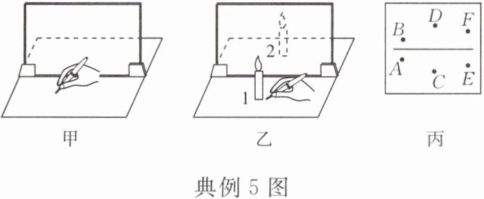 (3)如图丙所示,记录了三次物和像的位置,用直线连接$A$与$B$、$C$与$D$、$E$与$F$。分析图线后可得出像与物的连线与镜面垂直,还可得出的结论是