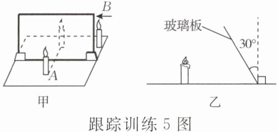 (3)小科同学在实验中将透明玻璃板与水平桌面垂直方向成$30^{\circ}$角放置,如图乙所示,请在图中作出蜡烛像的位置。