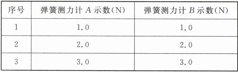 (2)2.0N;弹簧测力计A的示数为2.0N,说明弹簧测力计B对A的拉力大小为2.0N,由于物体间作用力与反作用力大小相等,所以弹簧测力计A对B的拉力大小为2.0N。