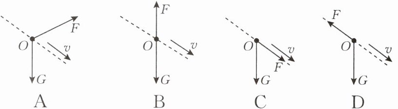[2025·浙江多校联考]如图所示为凤凰飞天秀,凤凰正沿直线朝斜右下方匀速运动。用 G 表示凤凰所受的重力,F 表示空气对它的作用力。下列四幅图中能表示此过程中“凤凰”受力情况的是(