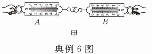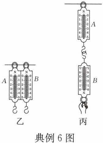 【实验 2】先将两个弹簧测力计 A、B 竖直悬挂、调零,如图乙所示;再把它们的挂钩勾在一起后悬挂起来,竖直向下拉测力计 B 的圆环,如图丙所示。