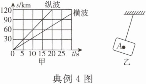 典例4 [2024·杭州拱墅区一模改编]地震时,震源的振动同时以横波和纵波两种形式向外传播,两种波在地壳中的传播速度并不一样;纵波到达时,人会感到上下颠簸,横波到达时,人会感到左右摇摆。台湾花莲发生地震时,某监测站测得两种地震波传播时距离(s)与时间(t)的关系图像如图甲所示,回答下列问题: