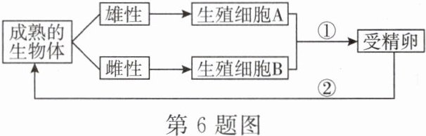 6. 如图所示是某些生物的生殖和发育过程示意图,其中①代表受精过程,②代表发育过程。请据图回答下列问题: