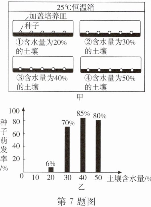 7. [2025·温州鹿城区二模]种子萌发需要一定的水分。为了探究花生种子萌发时土壤的最佳含水量,小明设计了如图甲所示的实验,并得到如图乙所示的数据。
