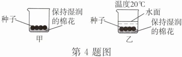 4. [2025·浙江多校联考]甲、乙两组菜豆种子分别置于如图所示的环境中,一段时间后,发现甲组种子萌发,而乙组种子不萌发。乙组种子不萌发的原因可能是缺乏