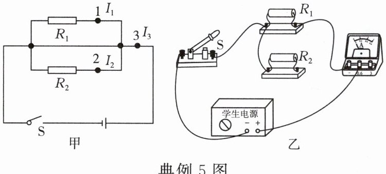 典例5 [2025·温州鹿城区二模]小明设计了如图甲所示的电路图来验证“并联电路的电流特点”。实验器材包括:1.5V恒压电源、定值电阻(5Ω、15Ω、20Ω、25Ω)、电流表、开关和导线若干。实验中,小明将电流表分别接入电路中的1、2、3三处测量电流,R₁阻值不变,改变R₂阻值,重复实验并记录数据,如表所示。