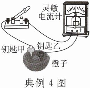 典例4 [2024·浙江]用导线将开关、灵敏电流计和材质不同的钥匙甲、乙相连,将两钥匙插入橙子中(如图)。闭合开关,灵敏电流计指针发生偏转。下列推测一定正确的是(