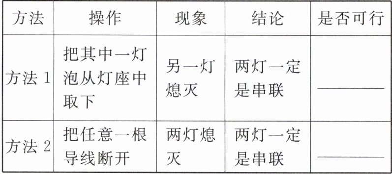 (3)另一同学将两只灯泡连入电路中,连接完成后,两灯泡都亮,但由于连线较乱,一时无法确定电路是串联还是并联。于是他提出下列两种方法来判断。请你判断两种方法是否可行,并在表中答题线处填写“可行”或“不可行”。