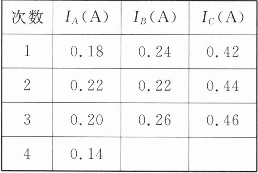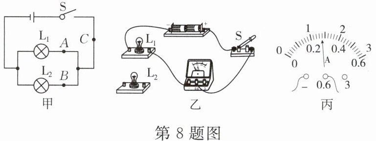 开关。(2)用电流表分别测量A、B、C三点的电流,更换灯泡多次测量,将实验数据记录在表格中。其中第4次实验中通过B点的电流如图丙所示,则I_B=