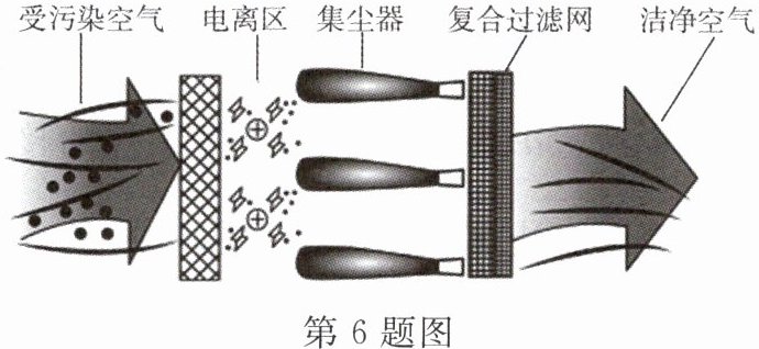 6. [2025·甘肃兰州]为了提升人们的生活品质,一些家庭安装了空气净化器,其工作原理如图所示。受到污染的空气被净化器吸入后,颗粒物进入电离区带上电荷,然后在集尘器上被带电金属网捕获。金属网吸引颗粒物的原理是