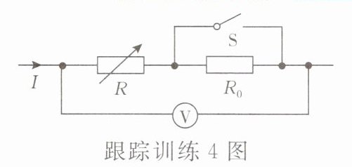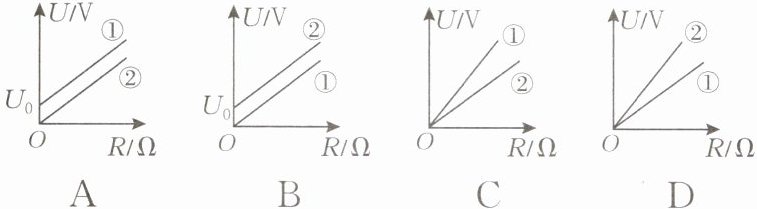 跟踪训练4 [2023·宁波]如图所示,电路中电流 $I$ 大小始终不变,$R_0$ 为定值电阻。闭合开关 $S$,据电压表示数 $U$ 与电阻箱阻值 $R$ 的大小关系可以绘制 $U - R$ 图线①;断开开关 $S$,据电压表示数 $U$ 与电阻箱阻值 $R$ 的大小关系可以绘制 $U - R$ 图线②。把 $IR_0$ 记为 $U_0$,下列能正确表示图线①、②的是(