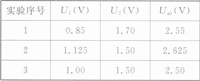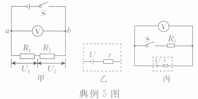 典例5 [2024·湖州二模改编]小吴利用两节新干电池、定值电阻(阻值分别为 $1Ω$、$1.5Ω$、$2Ω$)和一只电压表来探究串联电路的电压特点,实验电路如图甲所示,测得实验数据如表所示。