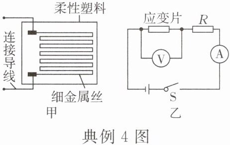 典例4 [2025·浙江多校联考]将一根细金属丝置入柔性塑料中,可以制成用来检测物体形变的器件——应变片,其结构如图甲所示。将它接入如图乙所示的电路中,电源电压不变,$R$ 为定值电阻。闭合开关 $S$,当应变片随被检测物体发生拉伸形变时,应变片中的金属丝会被拉长变细,导致电阻变大。下列关于电路中电表的示数变化的叙述正确的是(