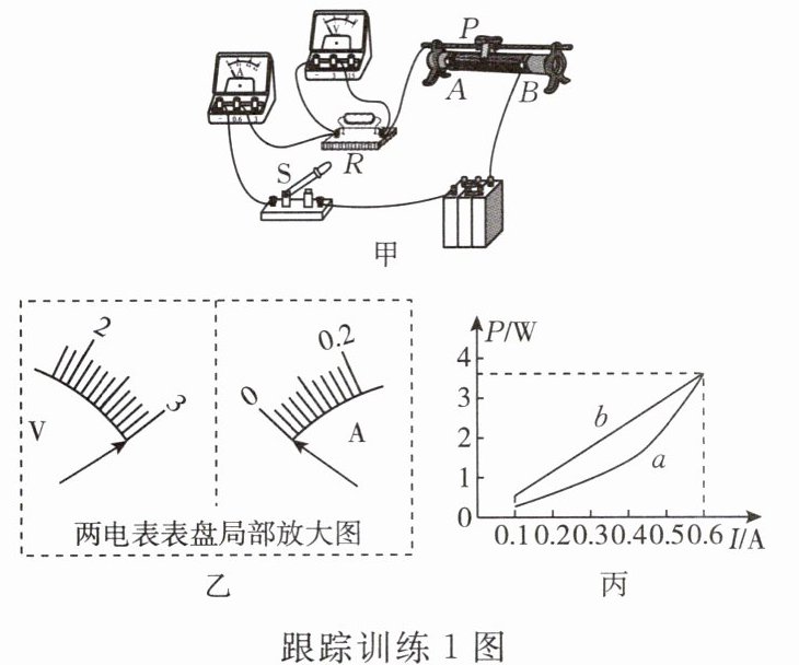 (3)替换了问题器材后,小杭移动滑动变阻器进行多次实验,绘制了电阻$R$的电功率随电流变化的曲线$a$和电路总功率随电流变化的曲线$b$,如图丙所示,请根据图丙推测滑动变阻器功率随电流变化的规律,并说明推测的依据: