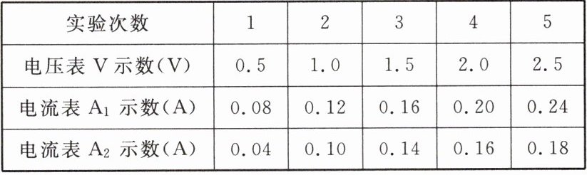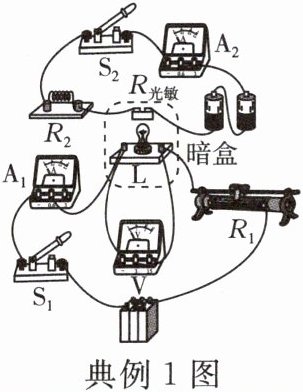 [2023·绍兴]为了探究灯泡亮度与灯泡电功率的关系,小敏用如图所示的电路进行研究(光敏电阻和灯$L$放置在暗盒内,外界光照无法进入),已知灯$L$的额定电压为$2V$,$R_{光敏}$的阻值随光照的增强而减小,$R_{2}$是保护电阻。连接电路后,闭合开关$S_{1}$和$S_{2}$,移动滑片调节灯$L$两端电压,记录电压表和电流表的示数如表所示。