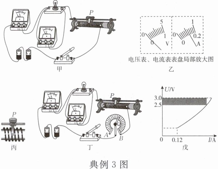 (选填“小灯泡断路”或“小灯泡短路”)。(2)故障排除后,闭合开关,移动滑动变阻器滑片$P$,小科发现无论如何左右移动滑片$P$,电压表指针都无法准确指在$2.5V$的刻度线上。老师告知小科,滑动变阻器的线圈结构如图丙所示,因此无法连续改变接入电路的有效阻值。小科思考后,在电路中接入旋钮型变阻器,继续实验。当滑片$P$和旋钮触片$Q$处在如图丁所示的位置时,电压表示数略小于$2.5V$,则小科应如何操作?