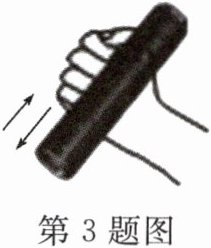 3. [2025·杭州校级模拟]如图是一种手摇发电的手电筒,当手沿箭头方向来回摇动时,灯泡就能发光。这个手电筒壳内有线圈,可以感受到有一个物块在来回运动,小明猜想这个物块是磁体,闭合线圈切割磁感线产生