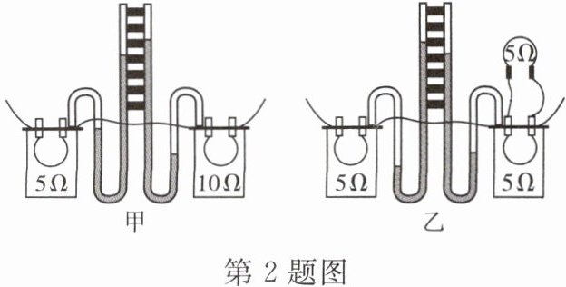 2. [2025·杭州钱塘区一模]如图所示为探究电流热效应的装置,甲、乙两套装置中各有两个相同的透明容器,其中密封着液体和一段电阻丝(阻值在图中已标出),$U$形管中装有等量的液体,接通电源,观察现象。下列说法不正确的是(