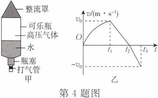 4. [2024·慈溪校级模拟]如图甲所示为项目化活动中制作的水火箭,在可乐瓶中装入适量的水,再用带有打气管的瓶塞将瓶口塞住,最后配置上火箭顶端的整流罩,将水火箭竖立于地面,利用打气筒通过打气管向瓶内打气,当瓶内压强足够大时,瓶塞脱落,瓶内的水向下喷出,水火箭竖直向上飞起。