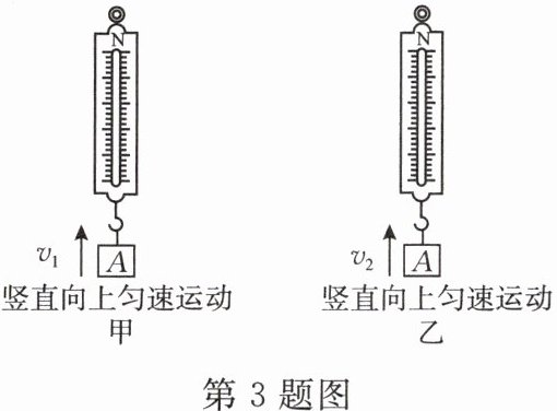 3. 重$2N$的物体$A$挂于弹簧测力计下,分别做如图甲、乙所示的匀速直线运动,运动的速度$v_{1} = 0.1m/s$,$v_{2} = 0.2m/s$,物体$A$沿速度方向均运动了$0.5m$。(不考虑空气阻力)