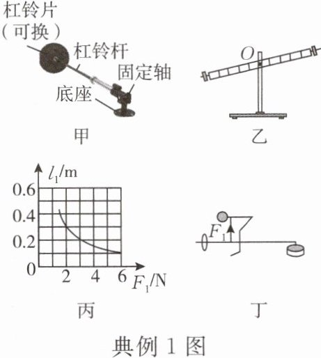 (选填“相等”或“不相等”)。(3)图丁中,手对杠铃的拉力 $ F_1 $ 与杠铃垂直。此时,杠铃为