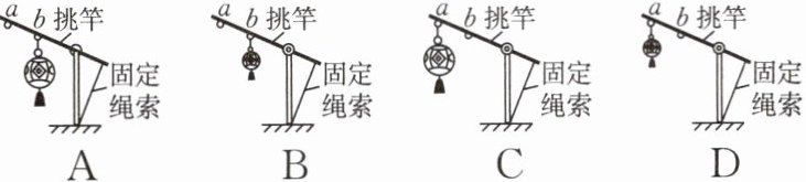 1. [2025·温州一模]在节假日悬挂灯笼营造喜庆氛围是民间传统的习俗。如图所示,将两个用相同材料制作的大、小灯笼分别悬挂在同一挑竿的不同挂钩下,其中固定绳索受到拉力最小的是(