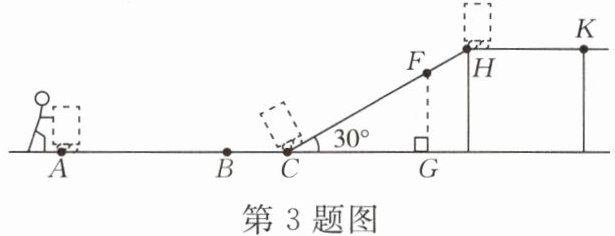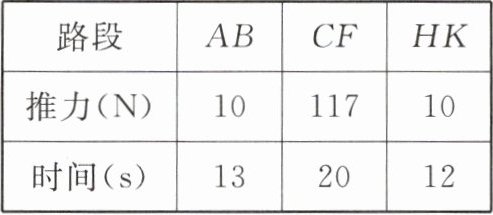 3. [2025·四川成都]工人把重为200N有轮子的箱子推到高处平台,如图所示。图中A、C、H是箱子在三段路面的起点,箱子经过AB、CF、HK路段时均做匀速直线运动,且所受推力方向与所在路面平行。表中记录了箱子在三个路段所受推力大小和运动时间的数据。$ AB = CF $,$ BC = FH $,$ HK = 2m $,$ FG = 1.3m $,忽略箱子体积。则下列分析正确的是(