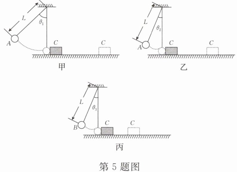 (2)如图乙、丙所示两组实验,图乙木块$C$滑行得更远些,由此得出物体速度相同时,质量越大,动能越大的结论。则实验中$\theta_2$$\theta_3$(选填“$>$”“$<$”或“$=$”)。