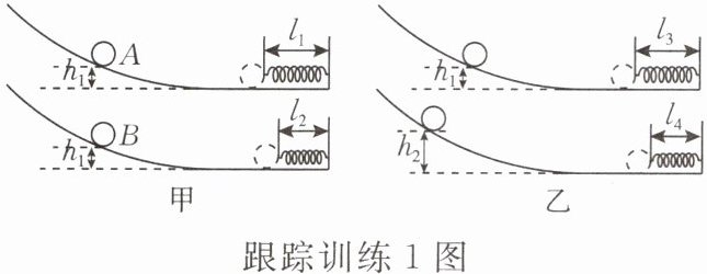 ②如图乙,将两个相同的铁球先后从装置的不同高度h₁、h₂(h₁<h₂)处静止释放,当铁球速度为零时弹簧被压缩后的长度分别为l₃、l₄;