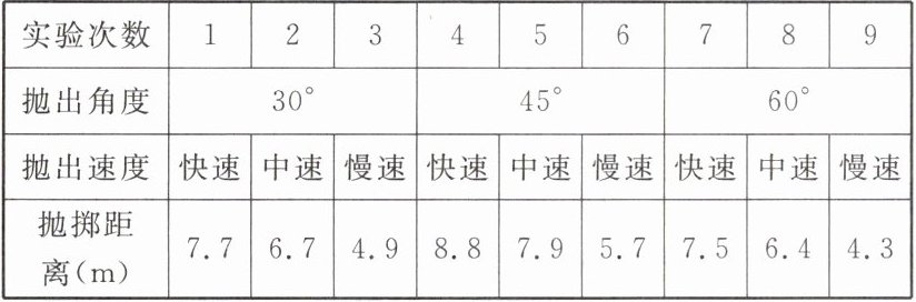 为了验证猜想,他选取了质量为4kg的铅球以及卷尺等其他器材,在同一水平地面上进行了多次实验,实验数据如表所示。