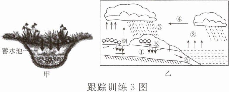 (2)图甲为温州北堤湖公园中“雨水花园”的示意图,其蓄水池在暴雨时可收集大量雨水,减少路面积水。这是因为“雨水花园”增加了图乙水循环中的
