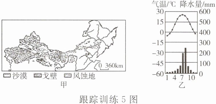 跟踪训练5 答题要点:①北方分布戈壁沙漠;②冬季气温低,沙漠冰雪覆盖;③春季温度上升,冰雪融化;④北方降水少;⑤对流;⑥冬季风风向。