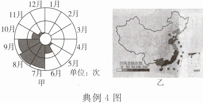 [2025·浙江]图甲为我国台风登陆月次数统计图(1949-2023年),图乙为我国台风登陆地区次数统计图(1949-2023年)。