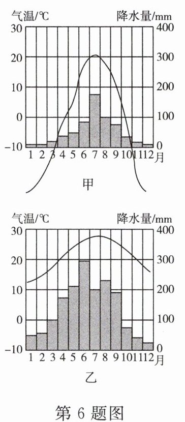 6. 请仔细解读甲、乙两地的气温和降水分布图,然后回答下列有关问题。
